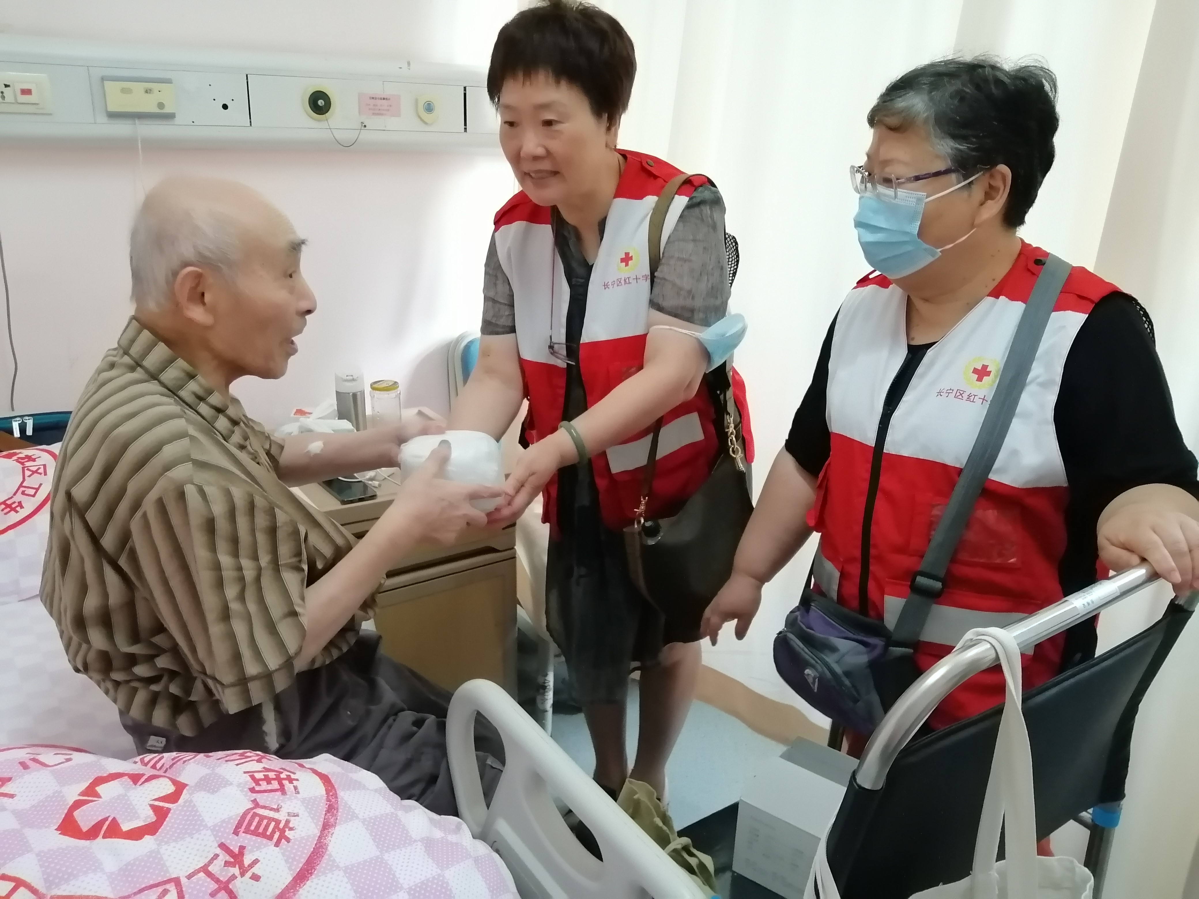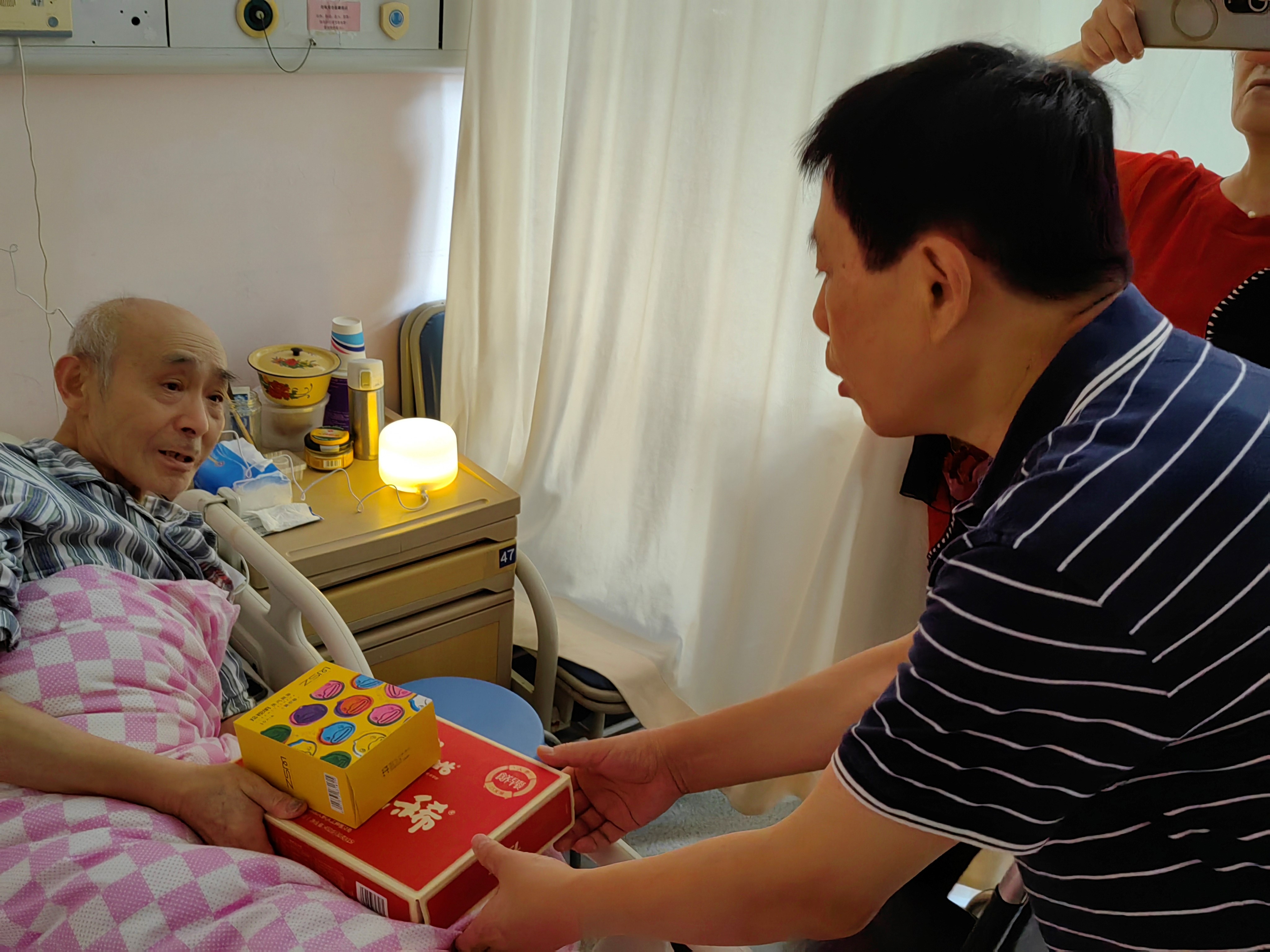 随后,俱乐部会长江雪飞、基金会陈会长、顶元为老服务理事长张蕾…一起走进病区,探望住院的临终病人,为他们送上了基金会赠送的人参米糊和眼罩,希望病人可以安静的休息,同时补充营养。还为病人送了熏香机。通过芳香疗法,可以帮助病人放松心情,睡眠安好,还可以起到止痛作用。把政府的温暖带给了安宁疗护的病人。病人们非常感谢党和政府的关怀。