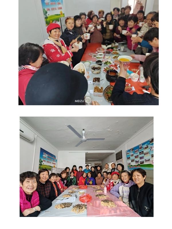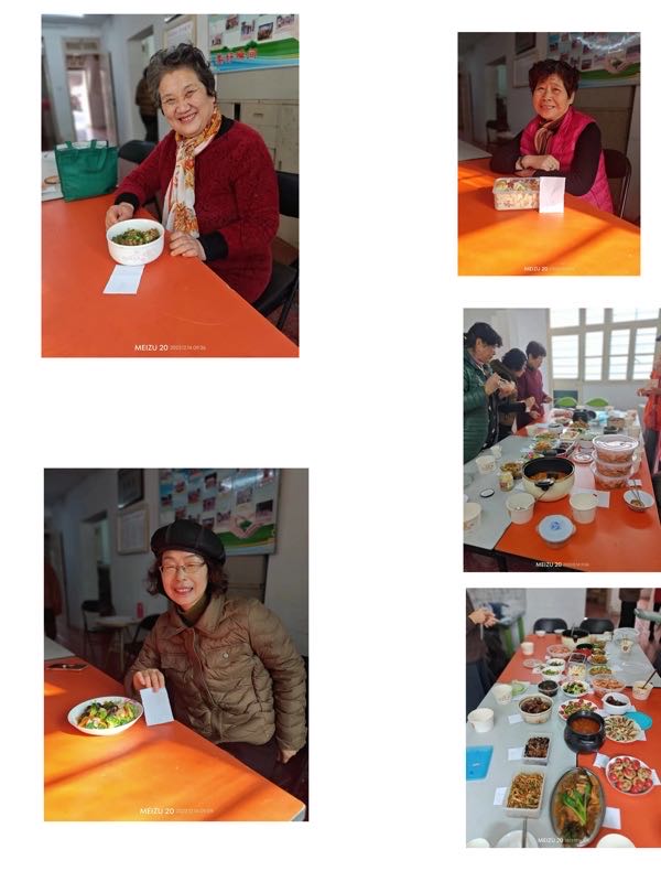 活动当天,石化站的几位骨干都早早来到俱乐部。她们除了带来各自准备的菜品,还贴心的为大家煮上了暖心暖胃的南瓜小米粥。大家一边备餐,一边统一了意见:我们作为评委,拿来的菜只提供品尝,不参与评奖。中午时分,参加活动的友友们陆陆续续的来了。她们有的转了两部公交,把保温袋稳稳地护在胸前。有的电瓶车的踏板上,放了一口大锅,格外醒目。有的到现场重新摆盘,点缀上小番茄、紫苏叶,尽显专业。有的菜品香气扑鼻,一打开盒盖,就赢得满堂喝彩。看得出,为了今天的活动,姐妹们都花费了很大的一番功夫。慧红为了做出满意的红烧鲤鱼,不仅选用了时令的冬笋和河钓的野生鱼,还在家里反复操练煎鱼的火候,力争做到鱼皮完整。琴宝改良了一款藕盒的制作方法,既不挂糊,也不油炸,仔细的把肉糜塞到每个藕孔里,文火两面煎的焦黄酥脆。有人考虑到伙伴们忌口,把菜谱中的鸡肉替换成鸭肉,有人精心挑选了无抗的肉丸、安徽采购的黑毛猪肉,主打一个健康美味。新“金山人”培姐姐制备的一冷一热两款菜品,都是老上海的传统美食。一向爱漂亮的宝妹妹,菜盘上也要开出一朵美丽的花来。忠芳姐为了觅到一种稀有的海捕鱼,清晨五点就在摊位上侯着了。看似寻常的罗宋汤和五彩虾仁,一个鲜香浓郁,一个Q弹爽滑,从“空锅”“光盘”的效果,可见其受欢迎的程度。神奇的是,二十多位姐妹,在互不通气的情况下,出手的所有菜品,竟没有一样撞车,而且鱼肉蔬果、红烧清蒸、干湿冷热,组合的恰到好处,也许这是大家多年来经常在一起活动所形成的默契吧。最后,通过评选,充分体现了鲜、嫩、香的香煎野生沙条鱼拔得头筹,美味和功力兼具的海派色拉、萝卜醸肉等五款脱颖而出,分获奖项。