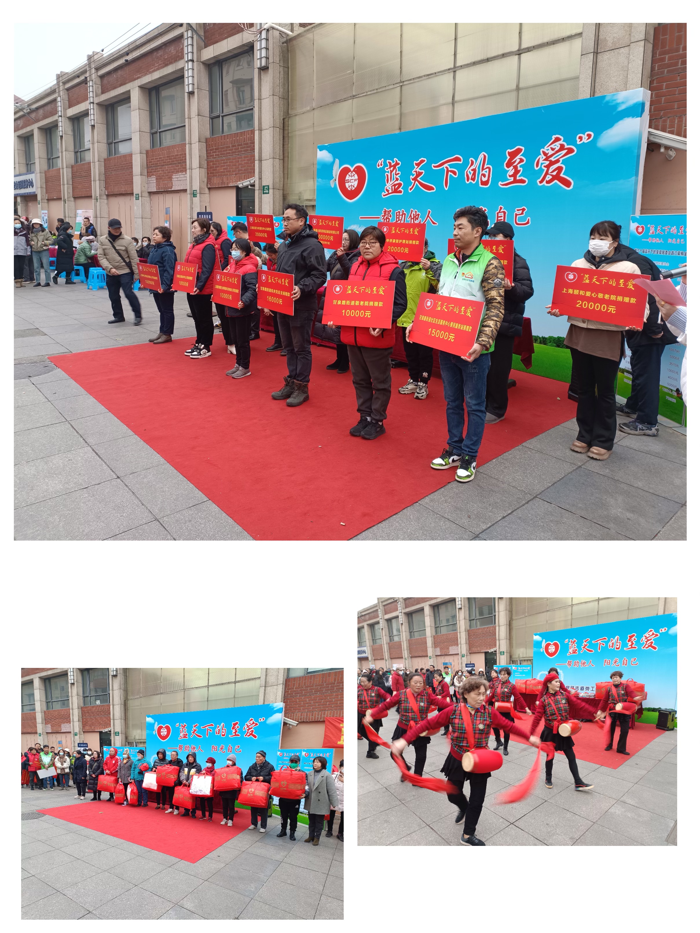 活动首先是老年腰鼓队表演,阵阵的锣声和鼓声给大家带来了欢乐的气氛。接着是许多单位给慈善事业的捐款、又有给困难人群捐物,充分体现了大家的社会爱心!