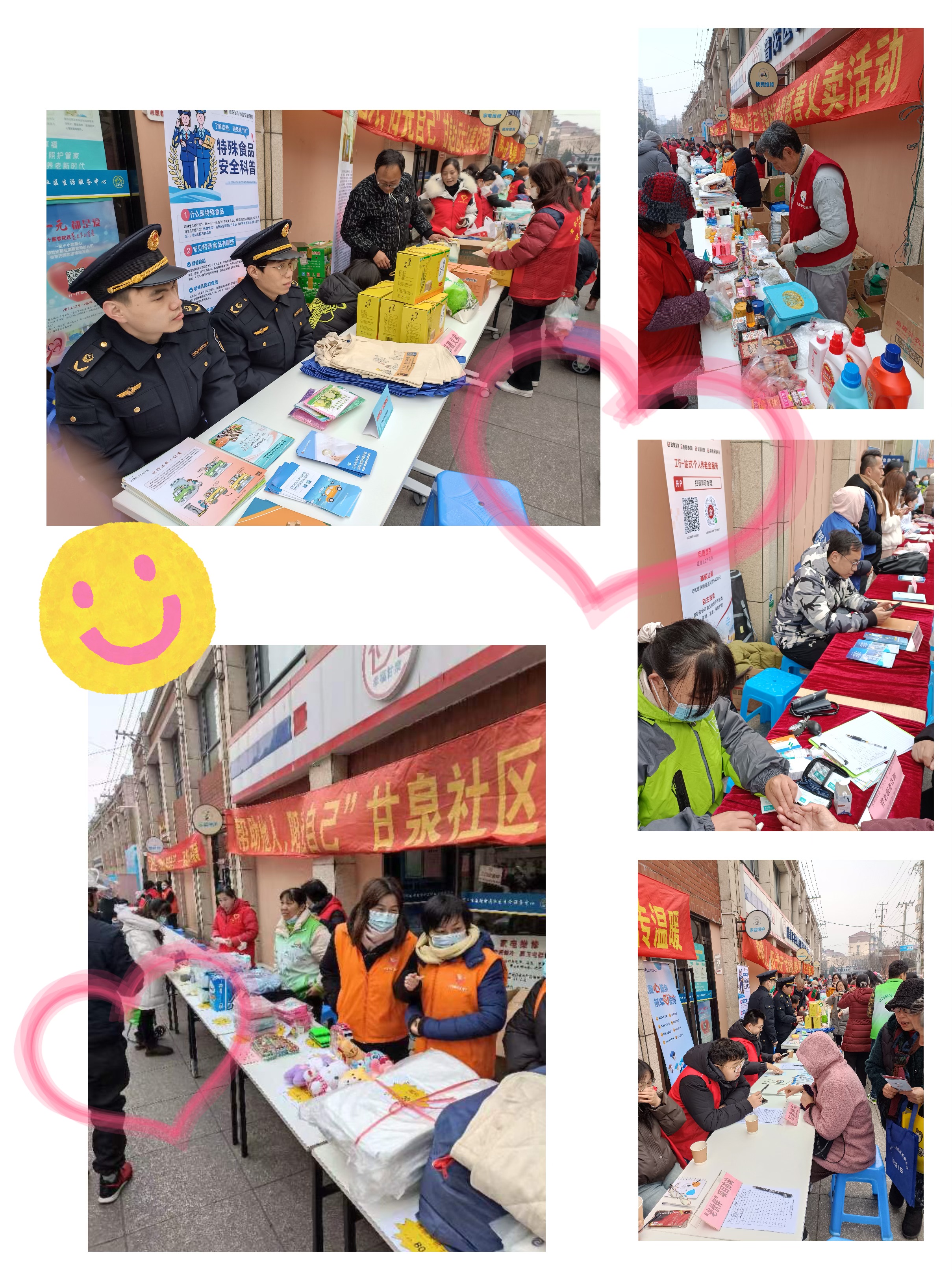 活动在上午九点不到就开始了,摆放在长长桌面上是各种各样的服务单位的铭牌和从事免费服务的项目,有修小电器的、磨刀的丶有法律咨询、反诈宣传、养老服务咨询……还有许多物品的义卖。