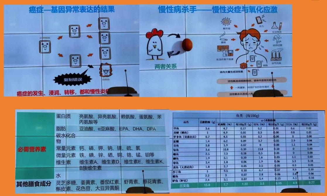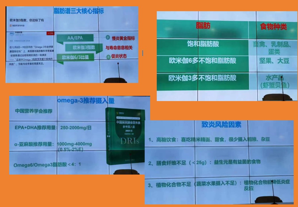 上海展望生物有限公司的高级营养师师董智老师普及了脂肪分为三大类:饱和脂肪酸、欧米伽6多不饱和脂肪酸和欧米伽3多不饱和脂肪酸。董老师就脂肪谱三大核心指标——欧米伽3指标、欧米伽6/3比值和AA/EPA,进行数据分析,详细阐述了这些脂肪酸在日常食物中的含量,并着重建议我们增加欧米伽3多不饱和脂肪酸的摄入。鉴于每个人的消化吸收能力不同,他还强调了适当补充欧米伽3保健品对于整体健康至关重要,进而有助于防止癌症的复发与转移抵抗炎症风险