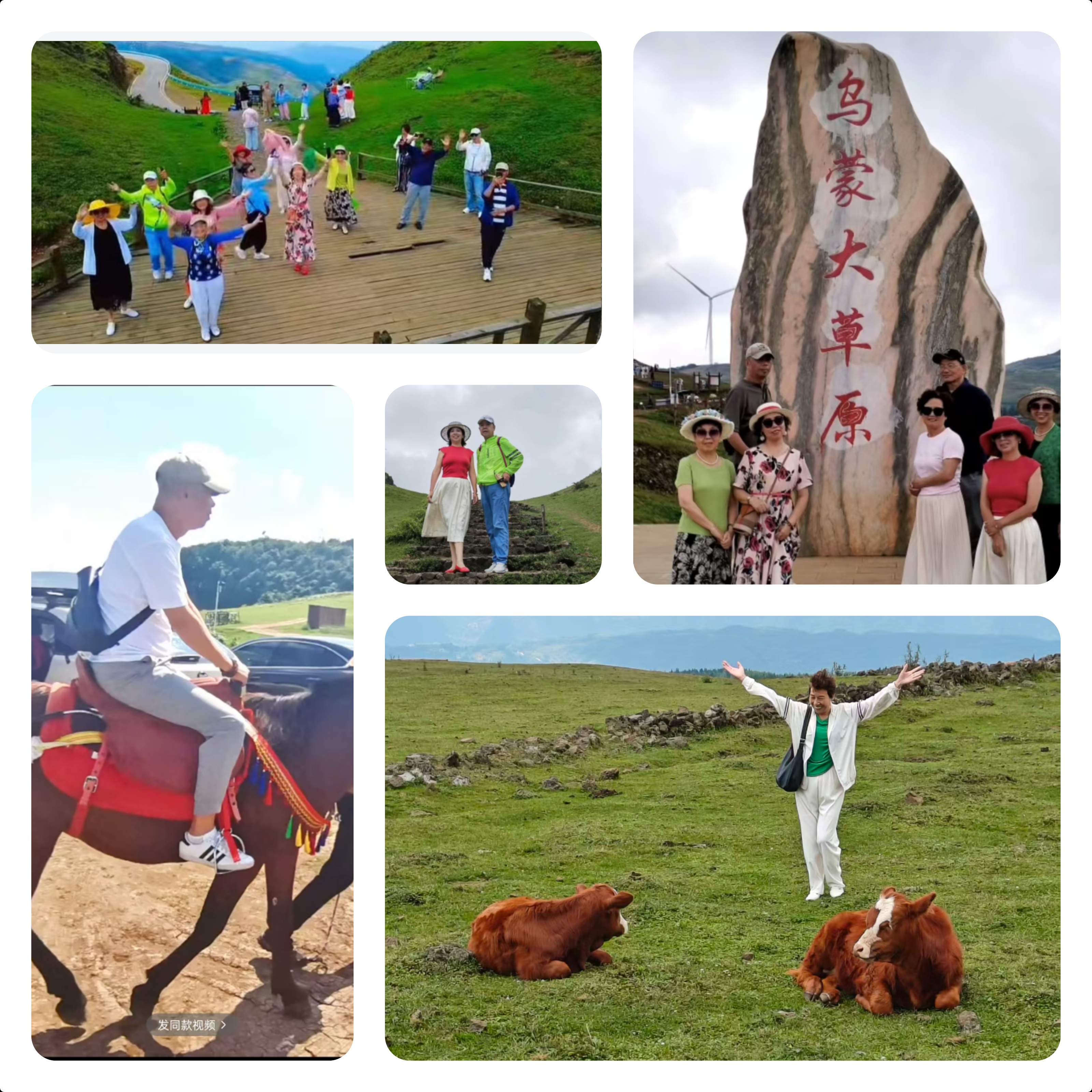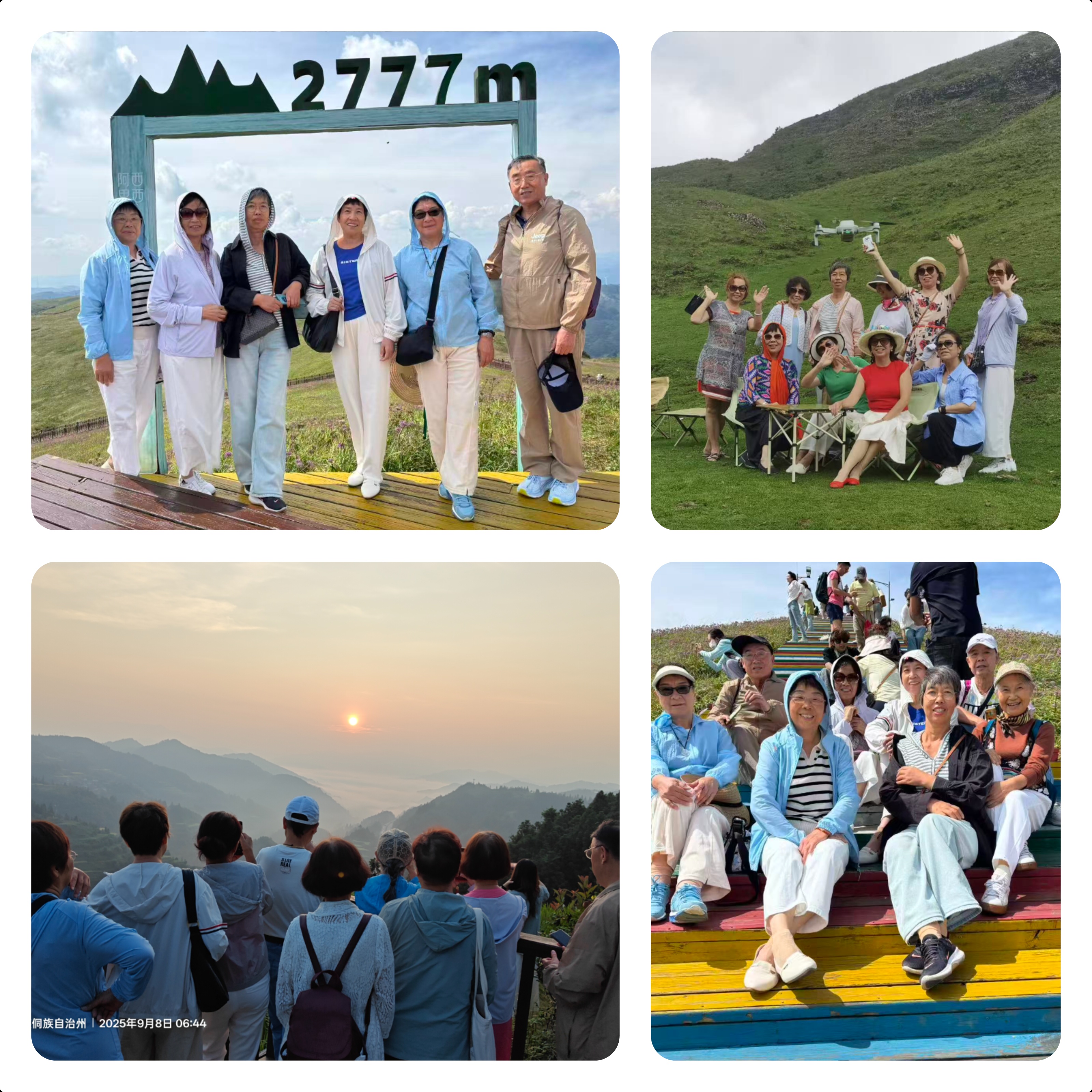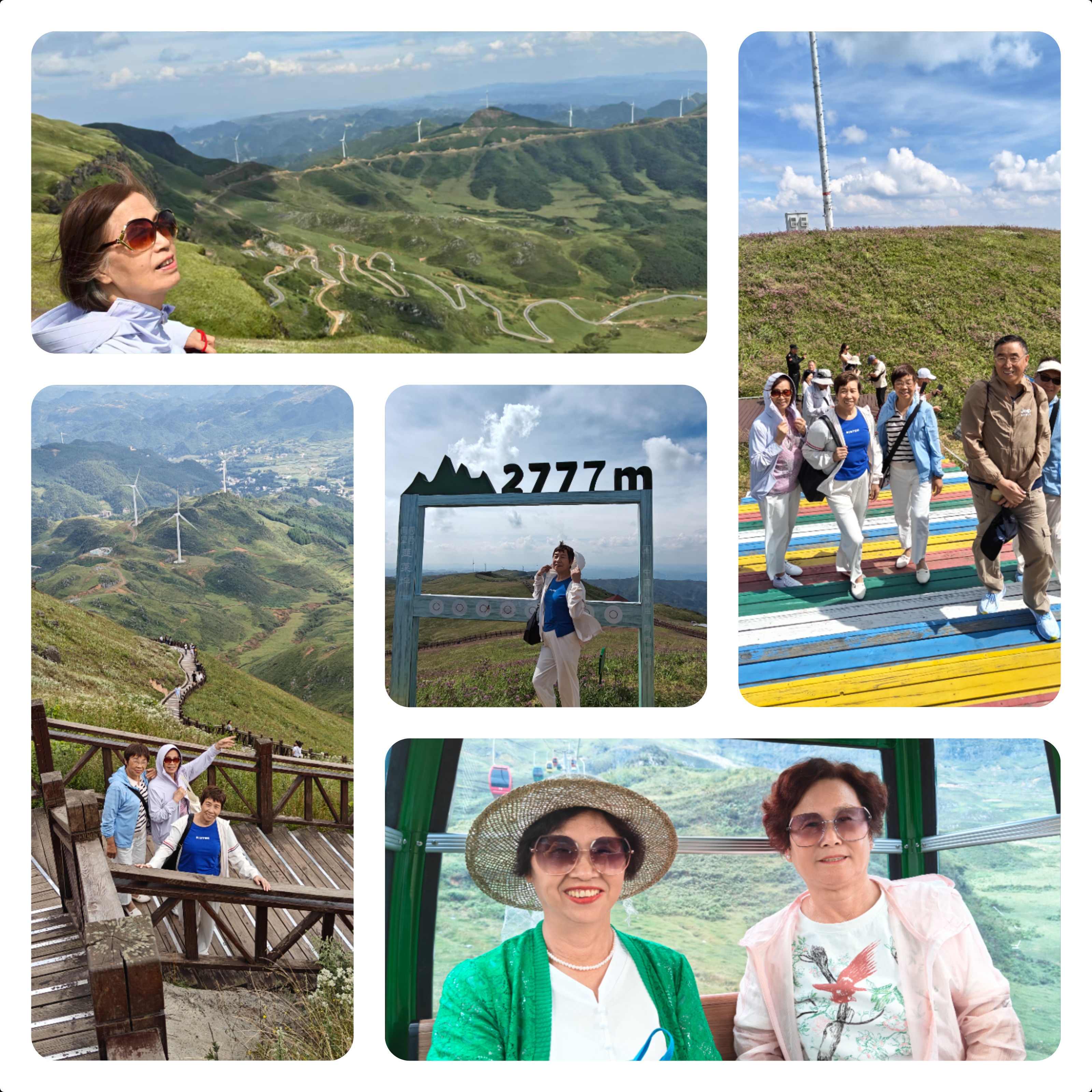 阿西里西韭菜坪是世界上最大面积的野韭菜花带。登上海拔2900.6米的贵州屋脊之巅,四周风景美不胜收,漫山遍野的韭菜花(全国仅有的野生韭菜花保护区)在秋风中摇曳,让人有种云中漫步的感觉。随处可见的风力发电机组,成为韭菜坪一道美丽的风景线。这里可是缆车上山,下山乘坐韭菜坪十道拐观光车西门(山顶服务区)。这天恰蓬9月3日,是抗日战争胜利80周年,小曾特地安排大家上午在宾馆里观看阅兵式直播,充分体现了我们的爱国情怀。