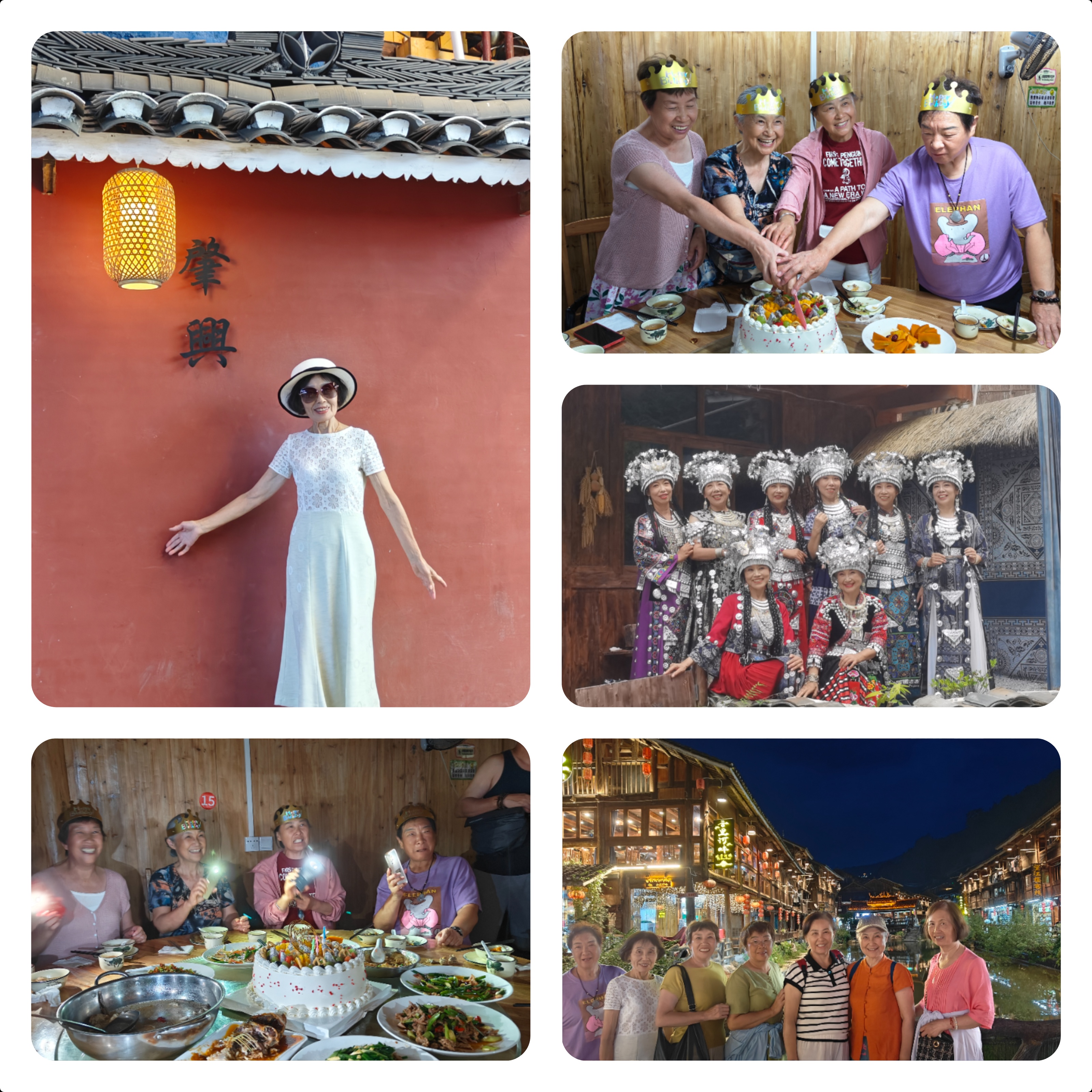 在肇兴侗夜游时,有队员走散,沈国珍不顾一天路途的疲劳(这天天还没亮就随着团队上山看日出),返程把队员找到并一路送回宾馆。同样在侗寨聚餐时,小曾为四位队员送上生日蛋糕,大家为她们过了一个意义非凡的生日会。团队中有几个队员体力超凡,每个景点都不落下,小曾就像特种兵一样,前前后后护着他们游完每个景点。