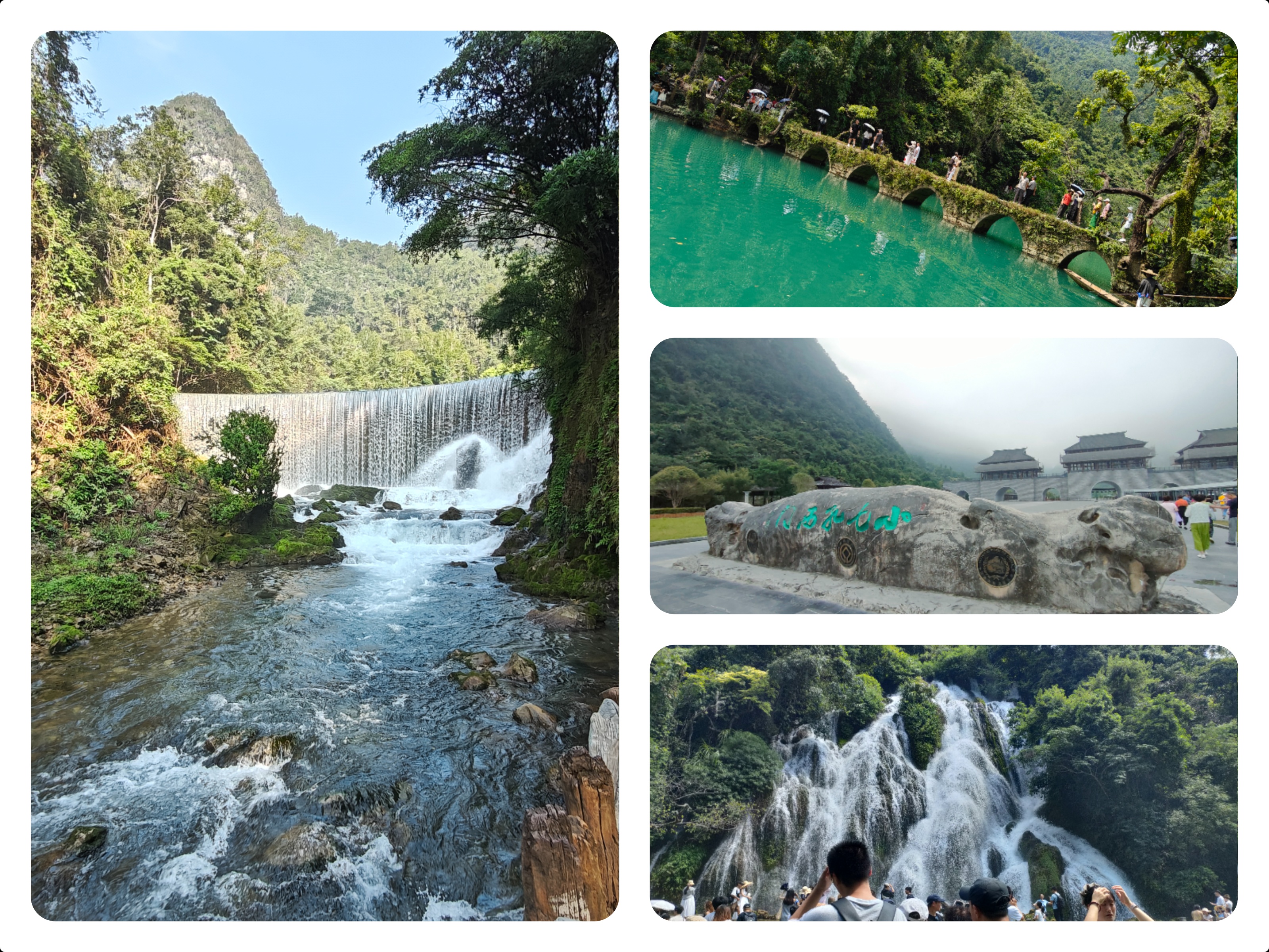 黄果树国家公园以喀斯特地貌为核心,整合了瀑布群、溶洞、古屯堡及湿地景观,涵盖黄果树瀑布、龙宫、陡坡塘等12个景区。游客们按天星桥、黄果树、陡坡塘的顺序游玩。陡坡塘瀑布是唐僧师徒四人取经的必经之地。瀑布高77.8米、宽101米,水帘洞是《西游记》的取景地。