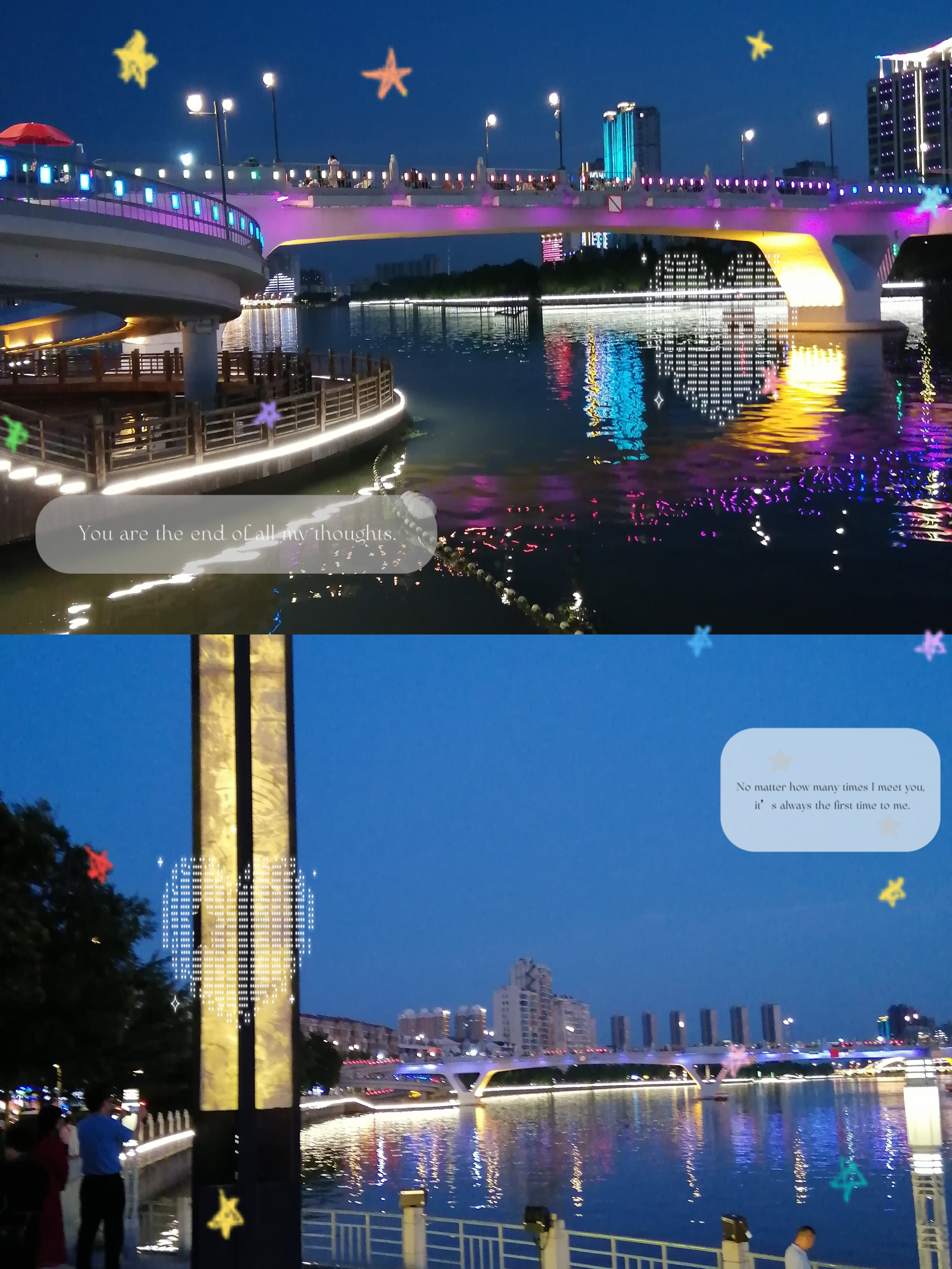 我们入住的宾馆在县城中心位置,属黄金地段,走出大门就是外滩一一射阳湖畔。当夜幕降临,所有的景观灯亮起,夜景非常美丽。桥上的灯光五颜六色,变幻莫测,闪闪烁烁,与桥下的湖水交相辉映,形成了一幅熣灿的耀眼画面,给人以美的视觉享受。我们一行人走上桥,看到有许多地摊,有卖水果、蔬菜、服装等等。而桥下有摆摊卡拉OK,音乐开得震天响,一派热闹的景象。