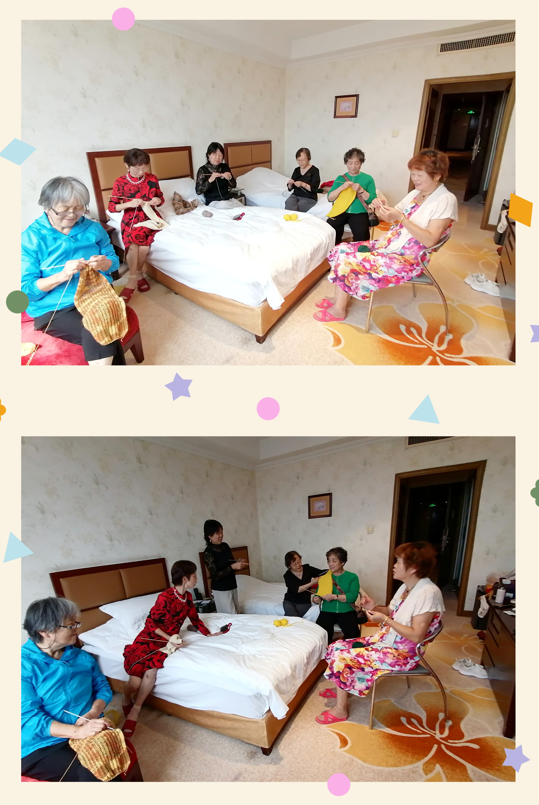 下午自由活动。会员们有的玩棋牌,有的唱卡拉OK,有的结伴外出散步。而曹杨块编织小组的6位会员,利用休息时间编织毛线围巾和帽子,为以后敬老院的慰问活动准备礼品。她们互相交流学习。刘梅兰不会结花型,虚心求教李丽珍对自己的作品不满意,把已经织成5寸长的围巾拆了,重新起针。她们非常认真,精神可嘉
