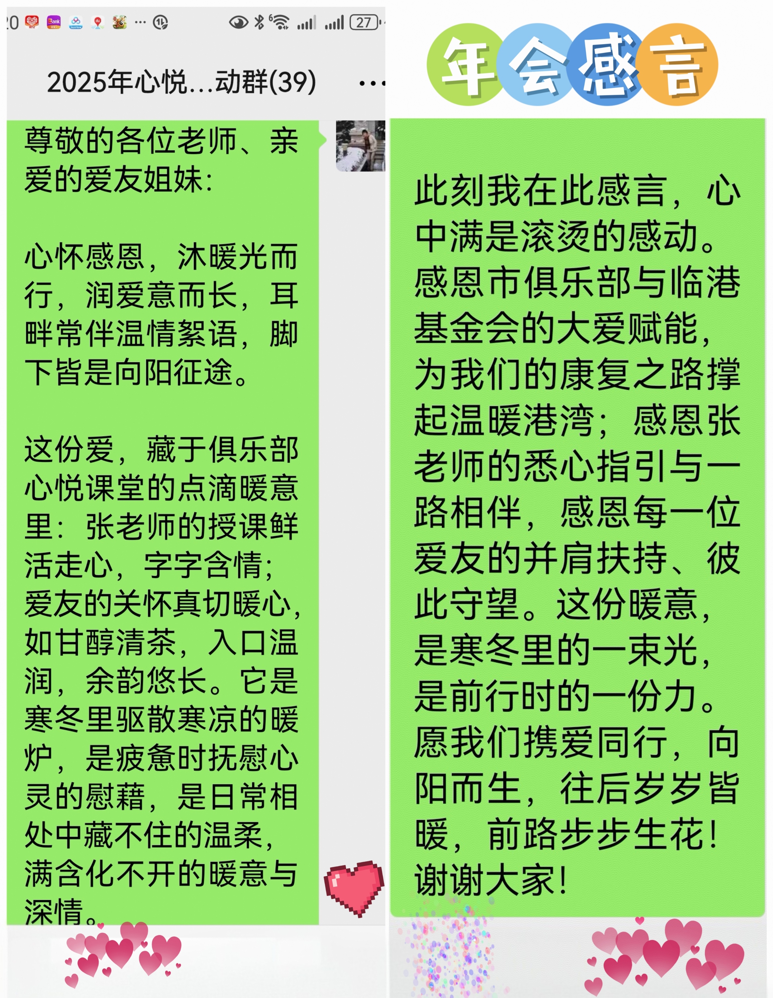 张老师随即揭晓年会流程:“今日欢聚一堂,愿大家尽情舒展心意、自在欢畅。有节目的姐妹可踊跃登台展示,无节目的姐妹也能分享感恩心声、畅谈康复感悟。形式自主灵活先自我介绍,再演节目或分享康复感言。让我们共赴这场温情满溢的相聚之约。”