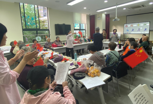 驿站老人今天特别高兴,人人手中挥舞一面小国旗。在姚玲护理员指挥下,老人们集体合唱一首《浏阳河》和《我和我的祖国》,会唱会员也一起合唱,气氛融洽,其乐融融。