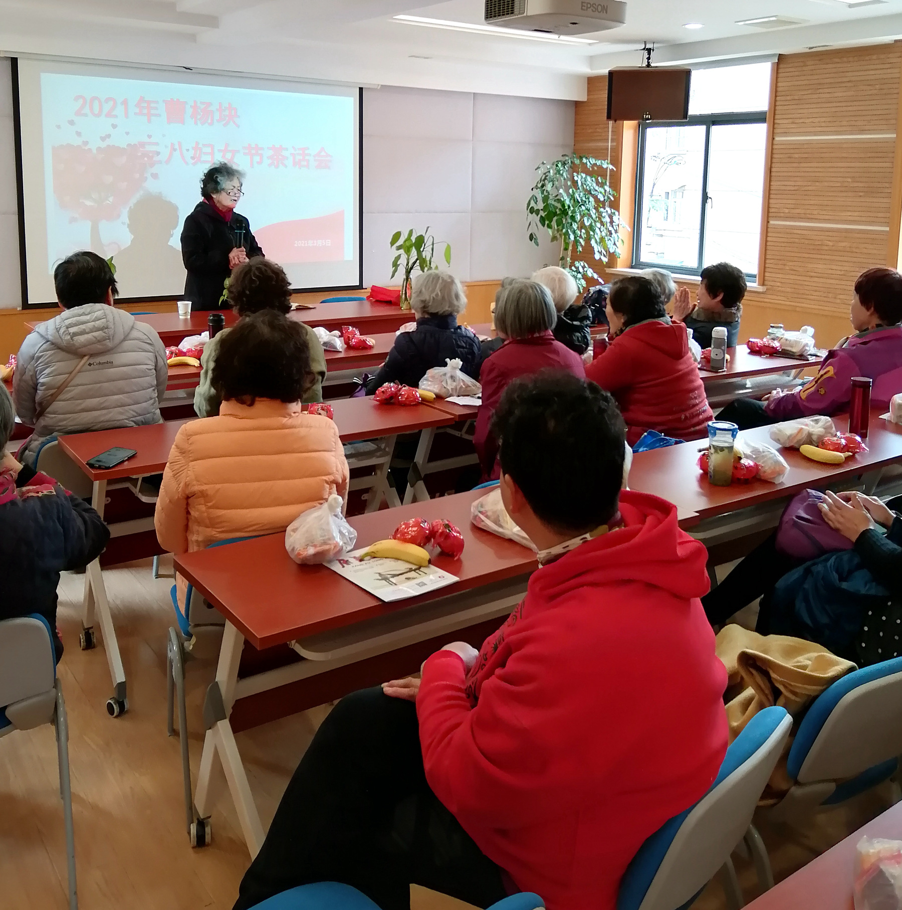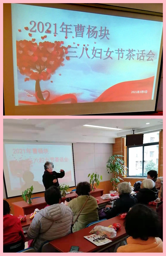35日上午9点,普陀曹杨块的会员们在梅岺支路的"同心家园"三楼会议室举办了庆祝"三八妇女节"茶话会。