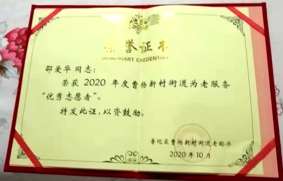 邵爱华:一位65岁,乳腺癌16年的康复者她热心公益,从事志愿者工作整整8年,与8位老人结对子,与老人感情深厚,时常去医院探望、陪伴老人。疫情期间,她还及时把口罩送到急需的结对老人手里。此外,她积极参加社区的"门岗值勤"她既是"平安志愿者""老伙伴志愿者",又是垃圾分类志愿者,摇铃队,楼组长。她为人热心,古道热肠。她被普陀区曹杨街道评为"2020年度优秀志愿者”,并颁发了荣誉证书,这是很不容易啊!而她在会上则谦虚地说:没什么,这是应该做的。朴素的语言深深打动了与会的姐妹们