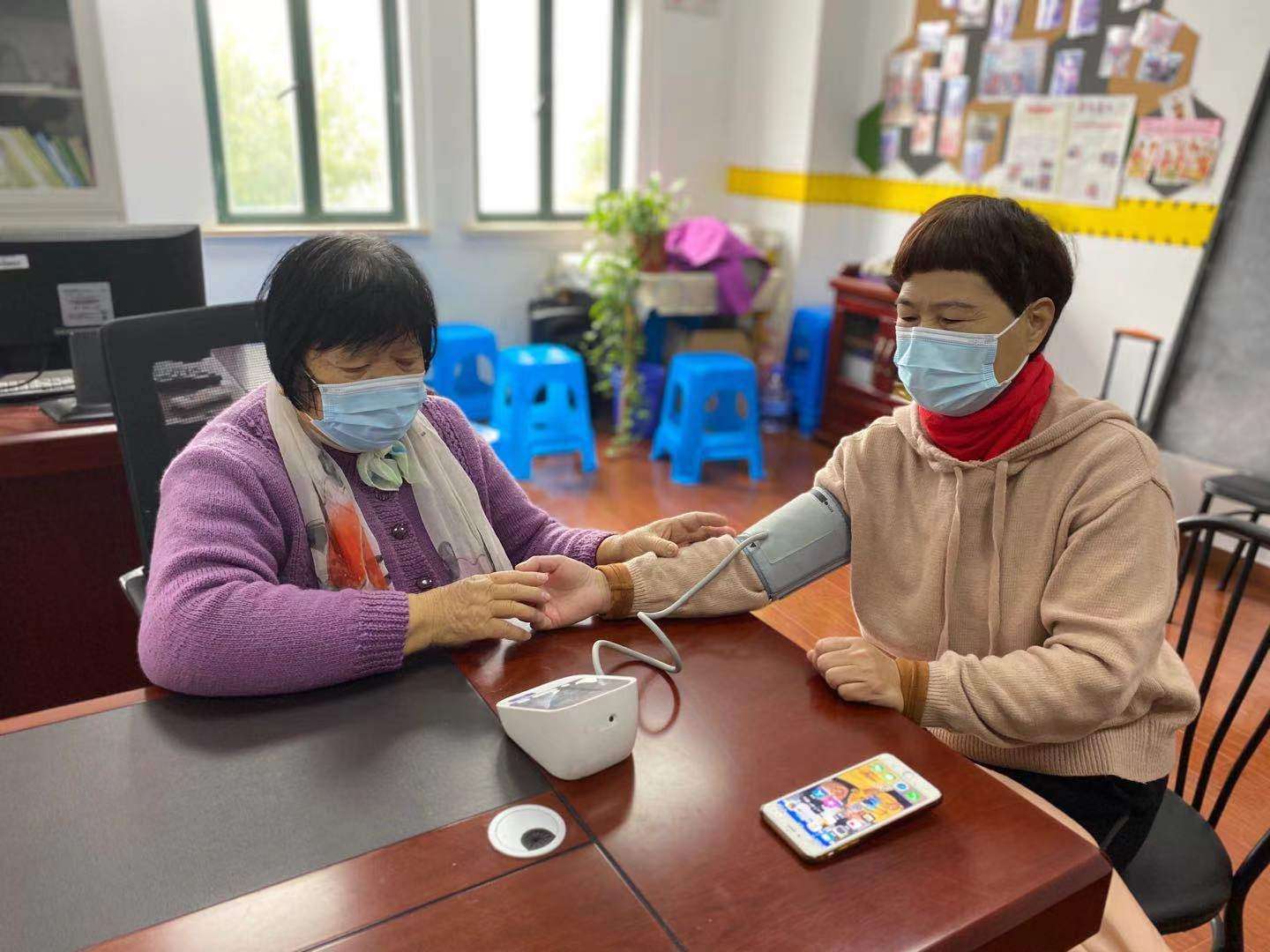 站长王建红和会员赵金仙在康复站办公室为会员测量血压,结束后迅速和其他志愿者汇合,加入清洁家园的活动。