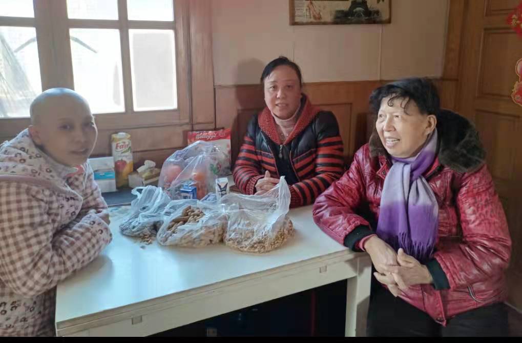 我和李萍联系着,询问她什么时候出院?近况如何?化疗反应大吗? 当我和许承定踏进李萍的家,看见她的一刹那,我们的眼泪已经在眼眶里打转了。她经过化疗头发光光,非常瘦小的身躯完全被棉睡衣裹着,我们不忍看着她,但是她却满脸微笑着,似乎看见了亲人似的,我们被他的热情和乐观深深地感动。她说了好多好多感谢的话,一件件一桩桩她是记得那么清晰,一次次的转危为安,凝聚了姐妹情,她说非常热爱这个家,给了她很多的帮助和温暖,我们衷心地祝福她早日康复!